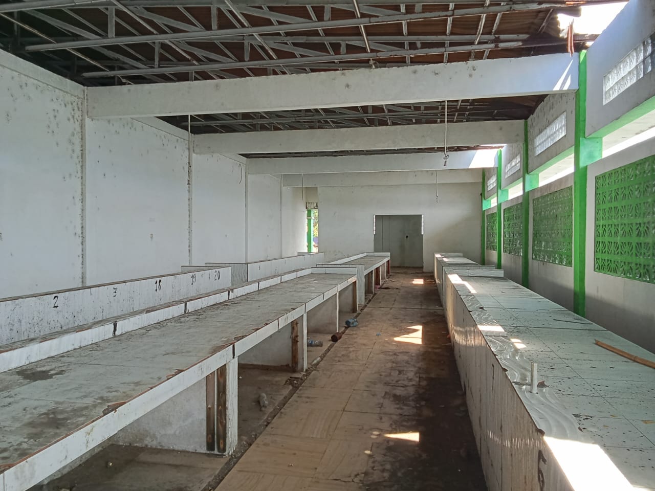 Di tengah teriknya siang, suasana di sekelilingnya terasa kontras. Gedung pasar yang luas tampak sepi, menyisakan deretan meja beton permanen yang kosong dan berdebu.