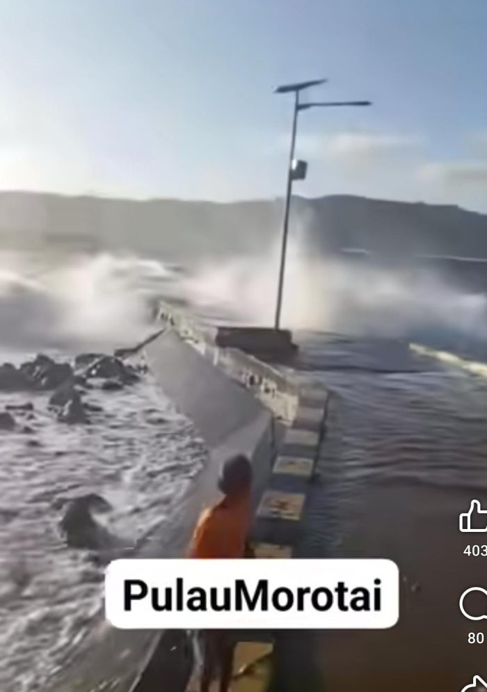 Dalam unggahannya, Jami Kuna menuliskan, “Cuaca sedang tidak baik-baik saja. Cuaca ekstrim sedang berlangsung, oleh karena itu yang hendak mudik harus hati-hati. Jembatan/Pelabuhan Wayabula Morotai Selatan Barat.”