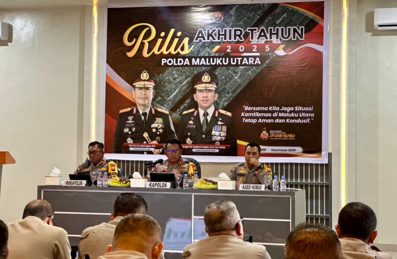 Hal tersebut disampaikan Kapolda Maluku Utara, Irjen Pol Waris Agono, dalam rilis akhir tahun 2025 yang digelar di Sofifi. Kegiatan tersebut turut dihadiri Wakapolda Maluku Utara Brigjen Pol Stephen M. Napiun dan Kabid Humas Kombes Pol Bambang.