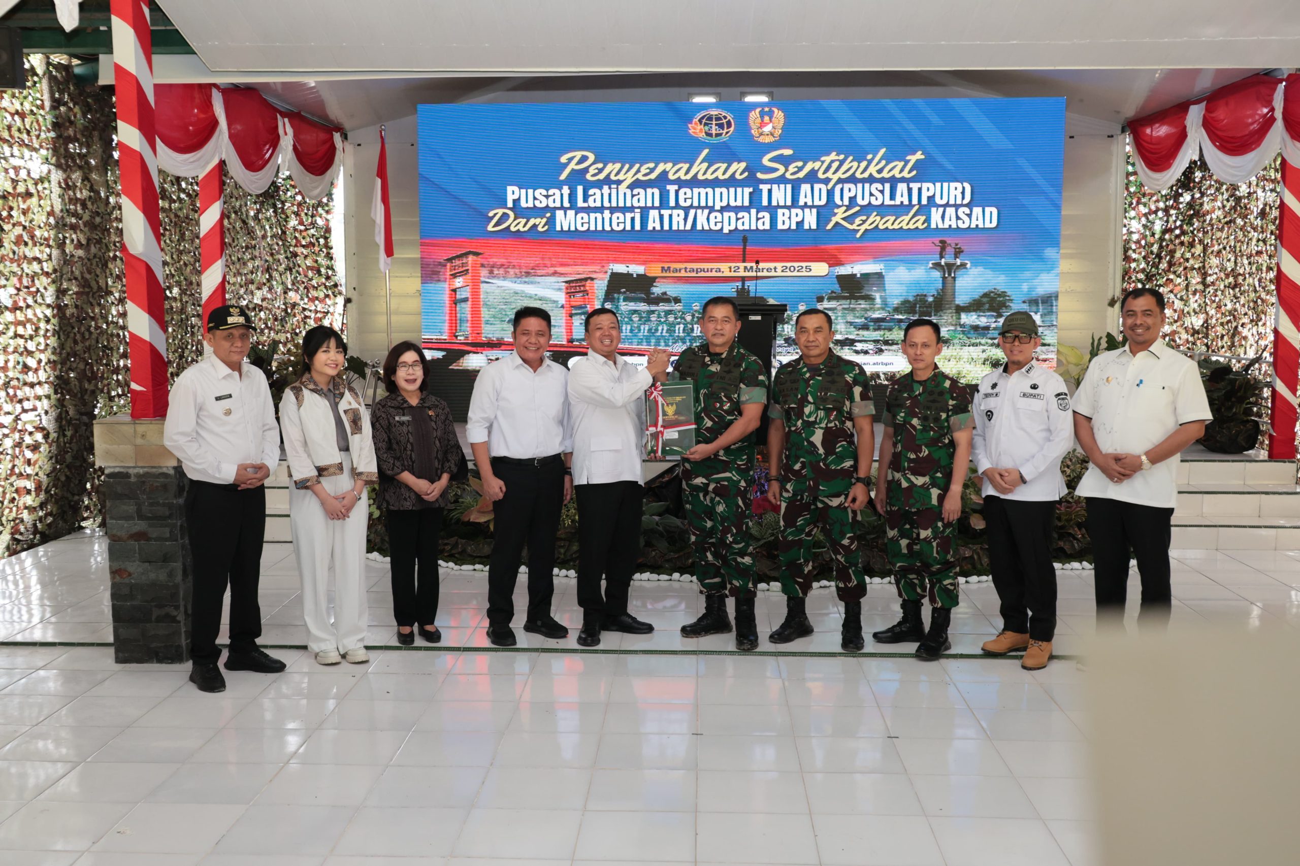 Menteri Agraria dan Tata Ruang/Kepala Badan Pertanahan Nasional (ATR/BPN), Nusron Wahid, menyerahkan 42 sertifikat untuk Pusat Latihan Tempur (Puslatpur) Komando Pembina Doktrin, Pendidikan, dan Latihan Tentara Nasional Indonesia Angkatan Darat (Kodiklat TNI AD) di Aula Puslatpur, Kabupaten Ogan Komering Ulu (OKU) Timur, Rabu, 12 Maret 2025.