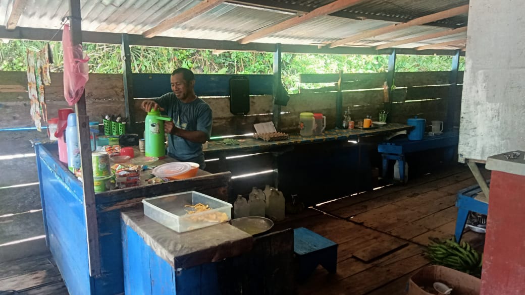 Setiap hari, sejak pukul tujuh pagi, Om Taken sudah membuka warungnya. Menu yang ia sajikan sederhana namun mengenyangkan: mi instan goreng atau kuah, pisang goreng, kelapa muda, kopi hitam, serta aneka minuman saset.