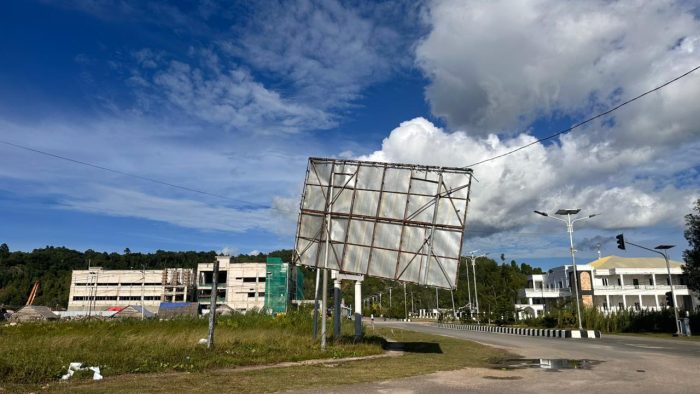 Papan reklame di pusat Kota Bobong, Pulau Taliabu, Maluku Utara, ambruk akibat angin kencang pada Minggu, 01 Januari 2026. Insiden ini bikin aktivitas jalan terganggu.