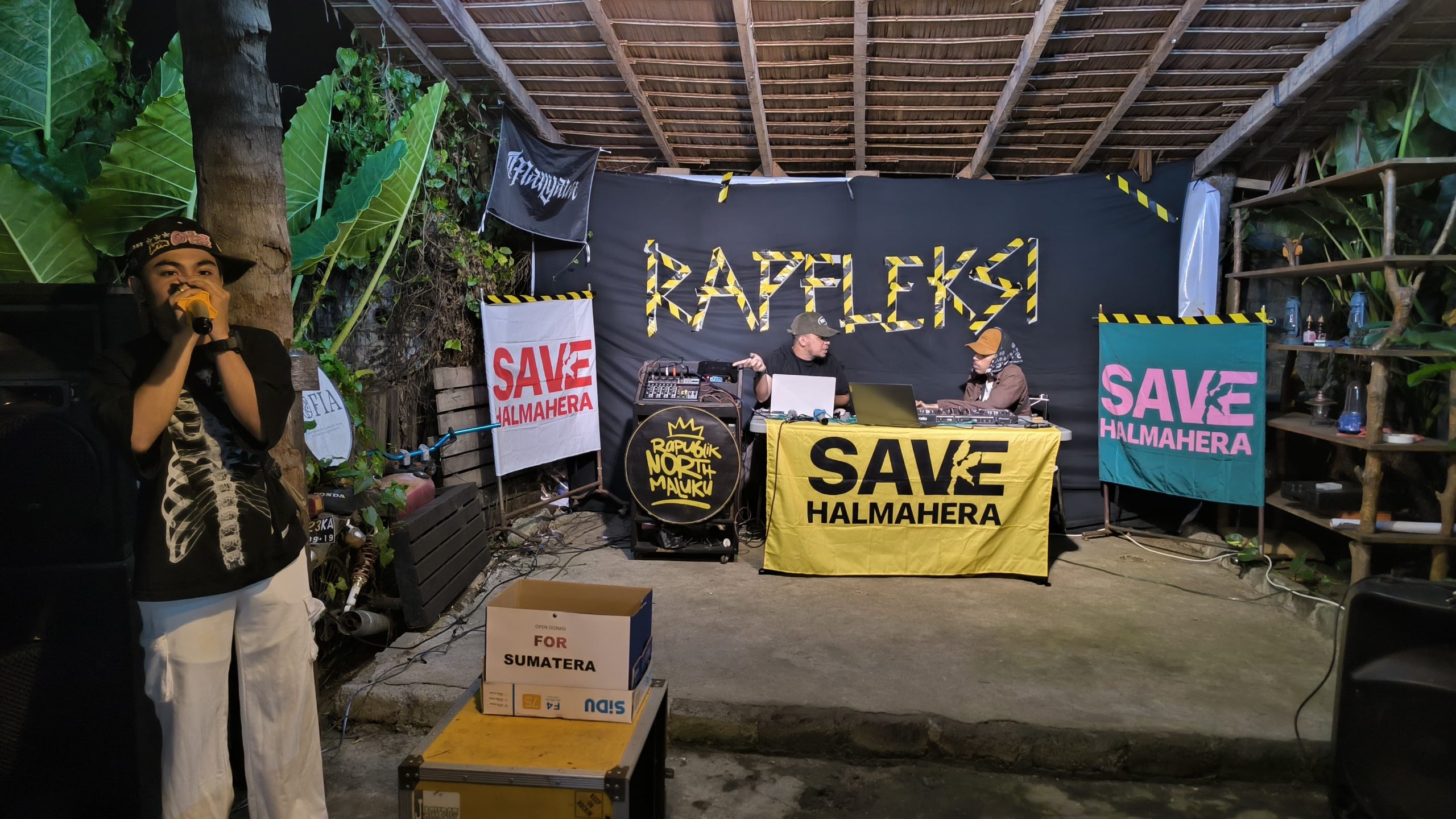 cermat melihat kesiapan lokasi kegiatan tersebut. Di panggung utama ada empat bendera; Manyawa dan Save Halmahera. Sebagai penanda gerakan bersama untuk melihat kondisi linkungan dan keberlangsungan hidup manusia yang kini daerahnya dikepung industri nikel.