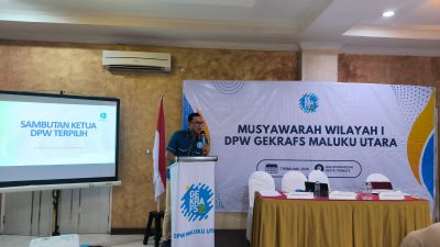 Imran Guricci, pengusaha muda Maluku Utara terpilih kembali secara aklamasi memimpin Dewan Pimpinan Wilayah Maluku Utara Gerakan Ekonomi Kreatif Nasional (GEKRAFS) saat Musyawarah Wilayah I di Royal Resto Ternate, Sabtu 07 Februari 2025.