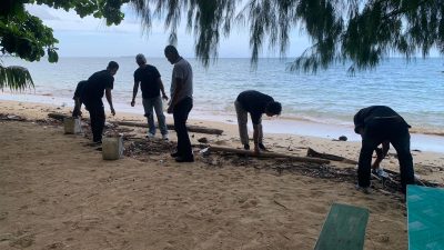 Personil Satuan Intelkam Polres Pulau Morotai melaksanakan kerja bakti di kawasan wisata Pantai Armydock, Kecamatan…
