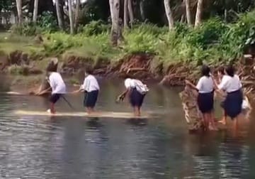 Dalam video berdurasi 1 menit 10 detik itu, tampak puluhan siswa harus mengantre untuk menyeberangi Sungai Ake Asimiro menggunakan batang pisang dan potongan kayu, lantaran tidak tersedia jembatan penghubung.