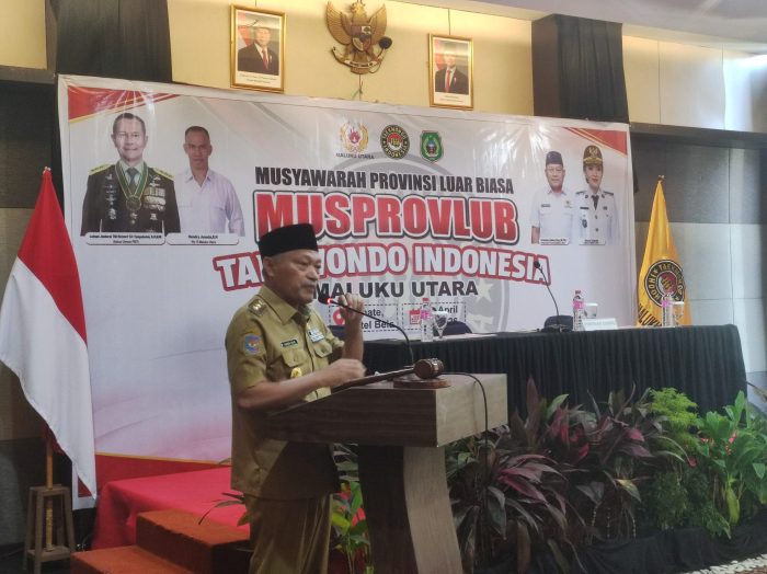 Sarbin Sehe Wakil Gubernur Maluku Utara, saat menyampaikan kondisi terkini Maluku Utara di sela-sela sambutan dalam kegiatan Musprovlub Taekwondo Malut. Foto: Eko Pujianto/cermat