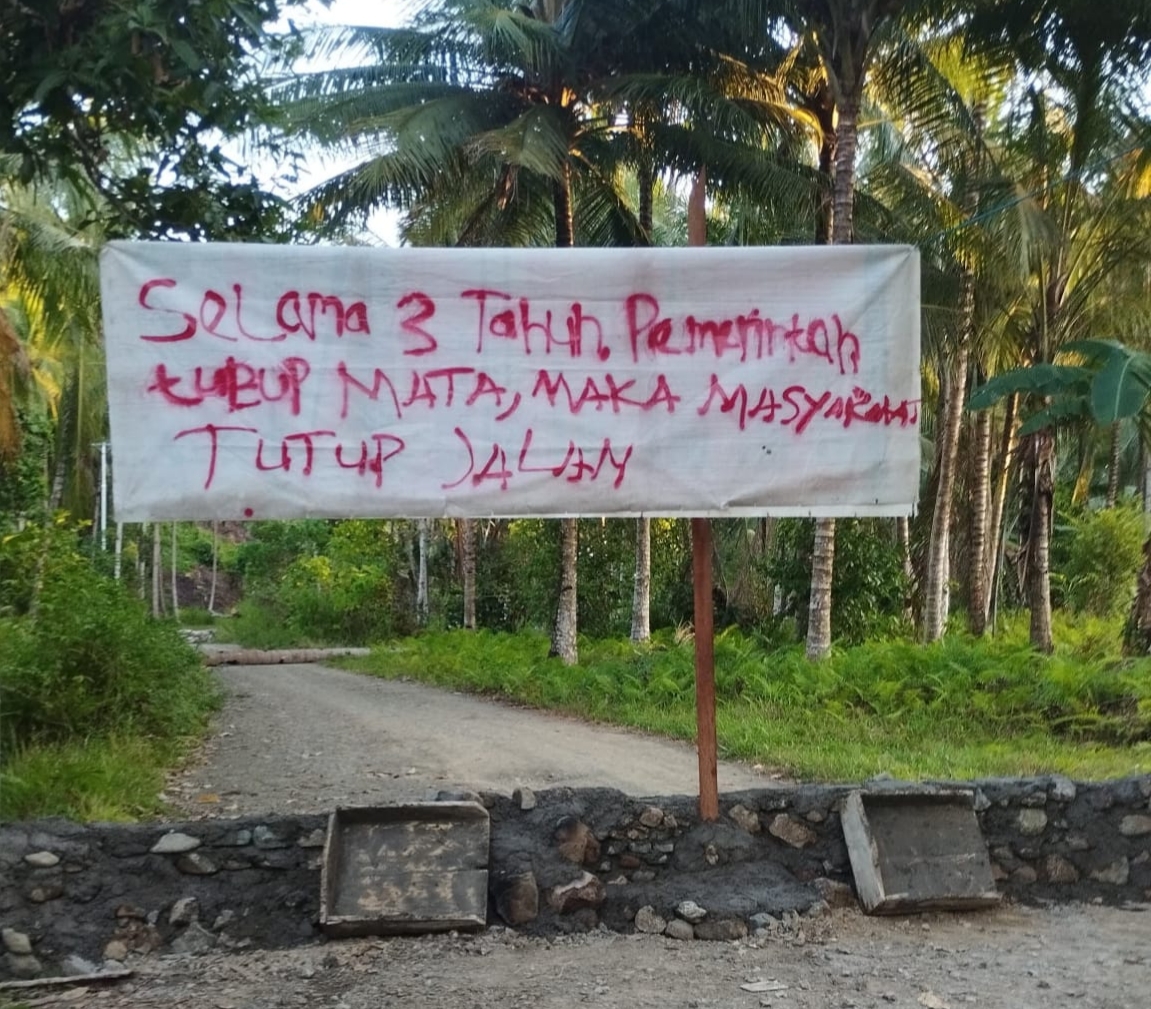 Aksi tersebut dilakukan dengan menutup badan jalan menggunakan material batu dan tanah. Masyarakat juga memasang spanduk tertulis protes terhadap pemerintah yang selama tiga tahun belum menuntaskan kewajibannya.